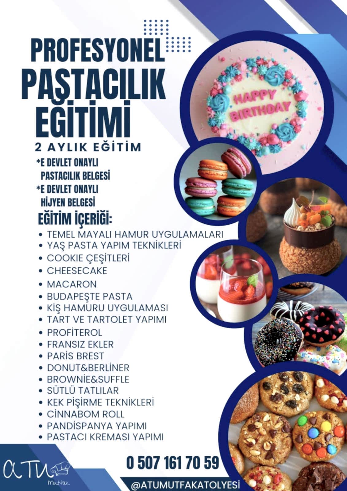 ATU Mutfak ailesine katılarak, elde edeceğiniz pratik deneyim ve sırlarla dolu bu eğitimimiz, pastacılık tutkunuzu profesyonel dünyaya taşımanıza yardımcı olacak. Atölyemizde sıcak bir atmosferde geçecek eğitimle hem keyifli zaman geçirecek hem de pastacılık kariyerine açılan kapıları aralayacaksınız. Unutulmaz lezzetlerin sırlarını keşfetmek için hemen yerinizi ayırtın. Kayıt olun, tutkunuzu mesleğe çevirin ya da lezzet dolu anılarla dolu bir maceraya adım atın!
